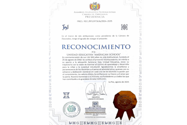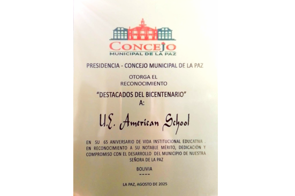 En conmemoración de sus LXV (65) años de vida institucional, fundada el 25 de agosto de 1960, se confiere el presente reconocimiento en mérito a su valioso aporte a la educación boliviana. A lo largo de más de seis décadas, esta Unidad Educativa ha sido un faro de formación académica y humana, acompañando a miles de estudiantes en la construcción de su proyecto de vida.